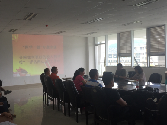 此次会议包括三个方面的议程:首先,由国伟经理做专题党课学习,学习的主题为“了解评估,积极投身‘一评估两认证’工作”。国伟经理针对本科教学评估和学位授权点合格评估两个方面的评估做了报告,报告中对全院的党员同志提出了三个方面的要求,要求所有党员同志全力以赴,全身心的投入到这两项工作中。其次,彭安辉书记做了第五次集中学习,学习内容为《中国共产党问责条例》,带领全体党员对条例里的内容一一进行了学习,并结合分院实际,希望党员干部要引以为戒,并且要以身作则,党内同志要积极对党的组织和党员干部进行监督。最后,由全体党员共同针对“能否保持良好精神状态,积极投身“一评估两认证”中,彭安辉书记、国伟经理以及各科室负责人就此问题进行了深入的探讨,表明了自己的态度。