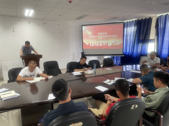 7月22日中午,球盟会国伟经理在体育馆三楼会议室上“中国共产党铸就的伟大精神”专题党课,党课由党委书记姚思勤主持,公司副科级以上干部、教研室主任及公司各党支部书记参加听课。