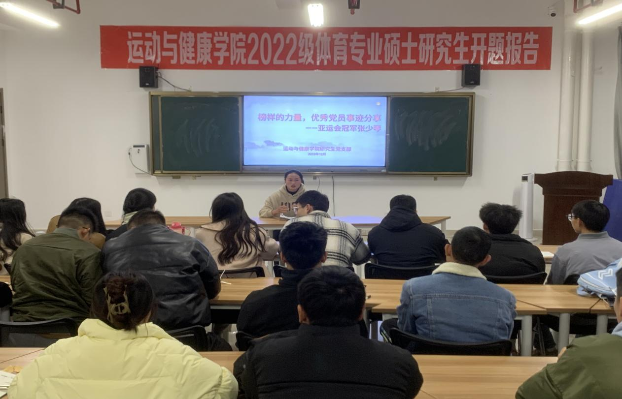 为深入推进学习贯彻习近平新时代中国特色社会主义思想,充分发挥先进典型示范引领作用,教育引导全体党员向榜样看齐、向榜样学习,球盟会研究生党支部于2023年12月7日在体育馆M层研究生教室组织召开“榜样的力量,优秀党员事迹分享”主题党日活动,对我支部优秀党员张少琴同志的先进典型事迹进行总结宣传。