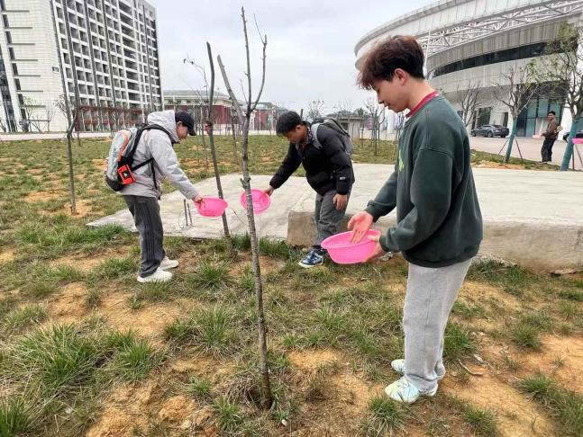 活动当日,球盟会研究生党支部的党员们准时抵达体育馆集合。大家热情高涨,分工明确,默契配合。有的党员手持铲子,认真松土,为花种生长创造良好条件;有的仔细撒花种,确保种子分布均匀;还有的负责填土、浇水,每一个环节都做得一丝不苟。在捡拾石头和垃圾废品时,党员们不怕脏、不怕累,哪怕藏在草丛角落的杂物也被一一清理出来,将捡出的石子统一堆放至指定地点。