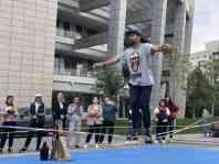黄家权精彩的开场表演点燃了观众的激情,各种惊险的花式动作表演使观众在惊叹之余,也更加了解和喜欢扁带这项运动。来自巴西的Gustavo GTO精彩的表演展现了扁带运动的国际风采,在他的带动下同学们跃跃欲试,扁带协会的成员也细心向同学们传授扁带的技巧。