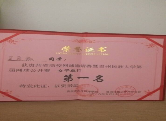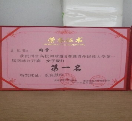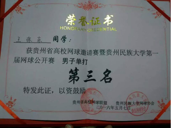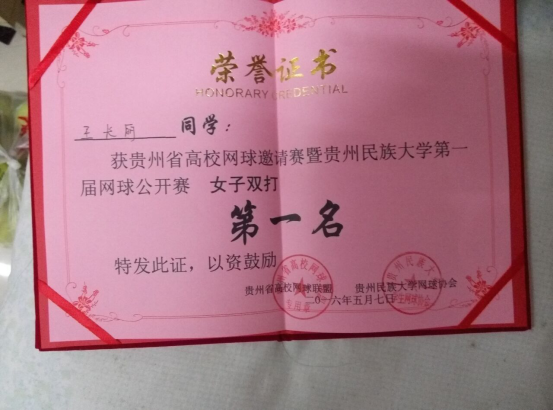 2016年5月7日,公司组队参加了贵州省高校邀请赛暨贵州民族大学第一届网球锦标赛,比赛在贵州民族大学进行。经过激烈角逐,球盟会参赛队员吴宗椒等三位同学发挥出色荣获佳绩,其中吴宗椒勇夺女子单打第一名,吴宗椒、王长丽斩获女子双打第一名,王琼东荣获男子单打第三名。