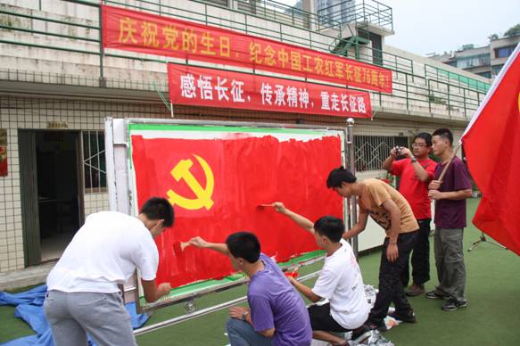 活动二:画党旗。走完长征路后,师生党员在展板上共同画党旗。