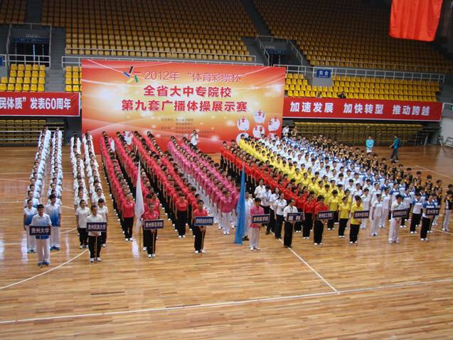 6月12日下午,由贵州省体育局、贵州省教育厅联合举办的贵州省大中专公司第九套广播体操展示比赛在贵州省体育馆举行,贵阳医公司代表队由大学体育教学部户外专业员工32名、教工8名共计40人组队参加了比赛,本次共有10个院校参赛,比赛经过激烈角逐,公司获得比赛“二等奖”。