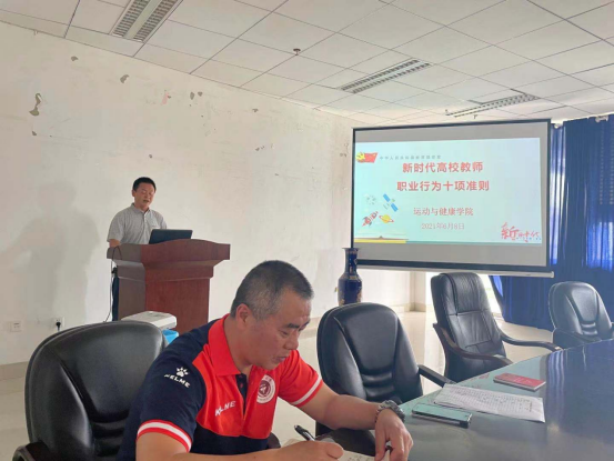 姚思勤同志带领全体教职工共同学习《新时代高校教师职业行为十项准则》,《准则》是新时代对广大教师落实立德树人根本任务提出新的更高要求,为进一步增强教师的责任感、使命感、荣誉感,规范职业行为,明确师德底线,引导广大教师努力成为有理想信念、有道德情操、有扎实学识、有仁爱之心的好老师,着力培养德智体美劳全面发展的社会主义建设者和接班人。同时从坚定政治方向、自觉爱国守法、传播优秀文化、潜心教书育人、关心爱护员工、坚持言行雅正、遵守学术规范、秉持公平诚信、坚守廉洁自律、积极奉献社会十条准则结合实例向全体教职工进行了详细的解读。