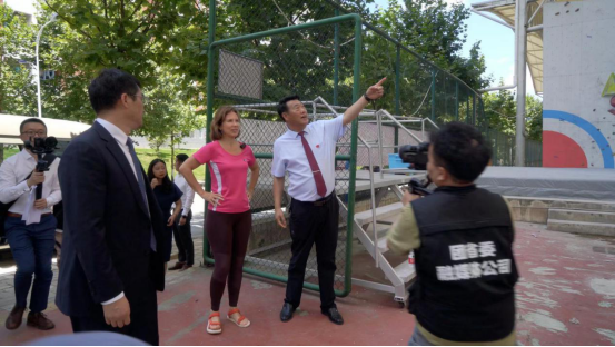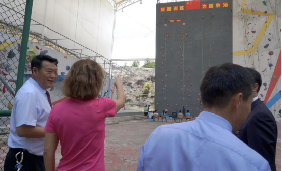 随后,吴若兰一行参观体验球盟会户外设施,观看户外运动专业员工攀岩练习、轮滑项目训练,在龙舟与皮划艇训练场地观看球盟会的教练和员工展示的龙舟欢迎列队。