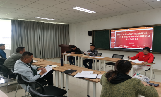 会议第二项,姚思勤领学《中华人民共和国教师法》、《关于加强改进新时代师德师风建设的意见》;国伟经理领学习近平总书记关于师德师风重要论述;周利副经理领学新时代高校教师职业行为十项准则;蔡啸副书记领学贵州省教育厅关于印发《贵州省高校教师师德失范行为处理办法(试行)》的通知。