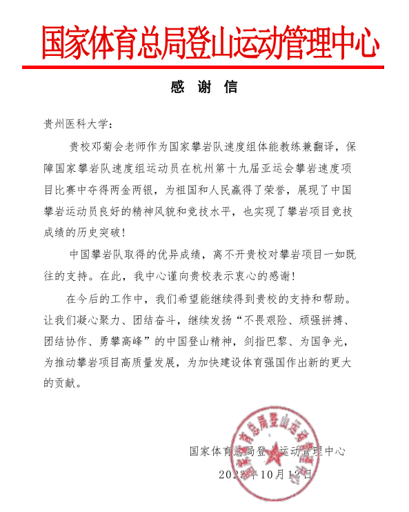 10月12日,国家体育总局登山运动管理中心对公司邓菊会教师作为国家攀岩队速度组体能教练兼翻译工作作出的贡献给予感谢。