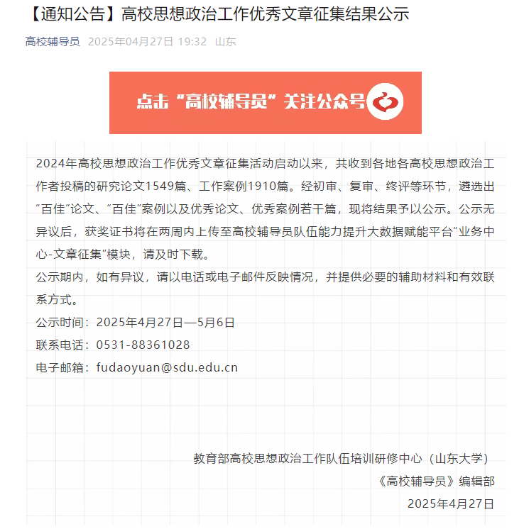 2024年,教育部高校思想政治工作队伍培训研修中心(山东大学)面向全国高校思想政治工作者开展了优秀文章征集活动。本次活动共征集到研究论文1549篇、工作案例1910篇。经过初审、复审、终评等多轮评审环节,最终分别评选出"百佳"论文、"百佳"案例、优秀论文和优秀案例若干篇。