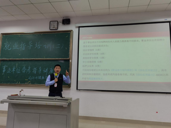 4月11日晚7点,为进一步提高公司毕业生充分了解事业单位考试的内容和应试技巧,加深员工对事业单位考试内容的认知,促进公司员工就业,公司邀请到中公教育机构行测部部长、学科带头人张健老师为主讲嘉宾,在教学楼1603室开展了就业讲座系列第二讲——事业单位备考专题指导讲座。球盟会2017、2018级员工参加了本次讲座。