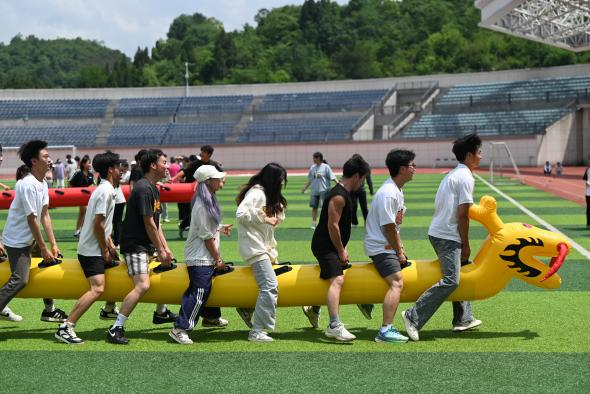 趣味运动会设有“毛毛虫接力”“无敌风火轮”“合力建塔”“有轨电车”“仰卧起坐”“雷区取水”“一圈到底”“共同进退”“接力跳绳”“纳斯卡巨画”等十个精彩项目。