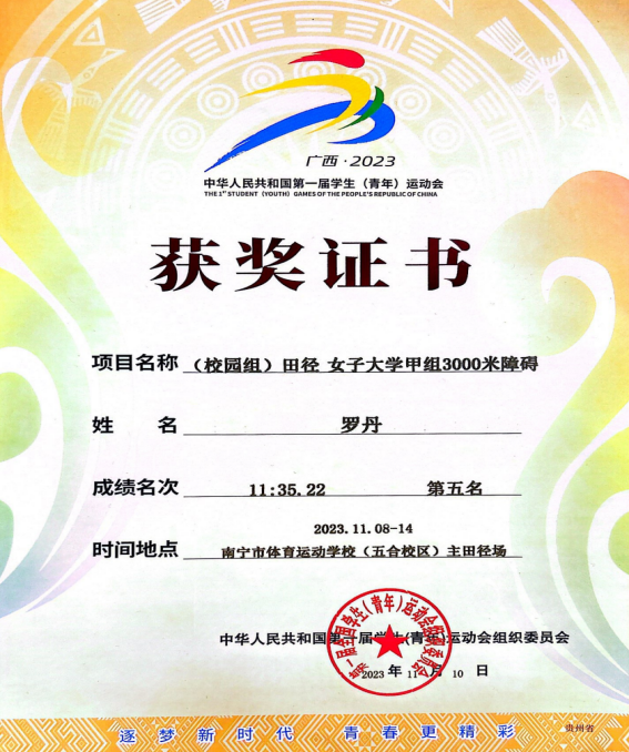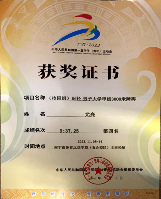 11月5日,由中华人民共和国教育部、中华人民共和国体育总局、共青团中央共同主办,广西壮族自治区人民政府承办,经教育部、体育总局、共青团中央批复的中华人民共和国第一届员工(青年)运动会在南宁市开幕。本届学青会共设39个大项、805个小项,吸引了全国近1.8万名运动员参赛。公司派出了2020级休闲体育专业尤亮、罗丹两位运动员参加了比赛,分别取得了决赛田径男子大学甲组3000米障碍第四和田径女子大学甲组3000米障碍第五的优异成绩,展现了公司学子的不凡实力。