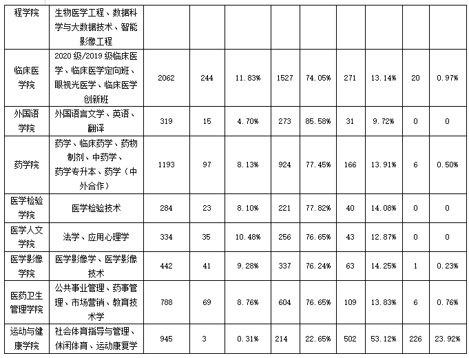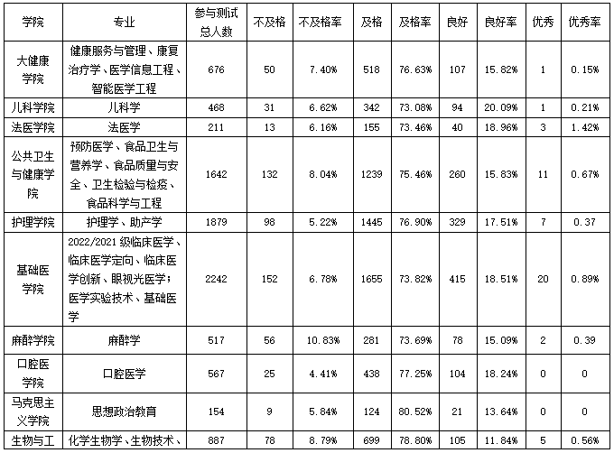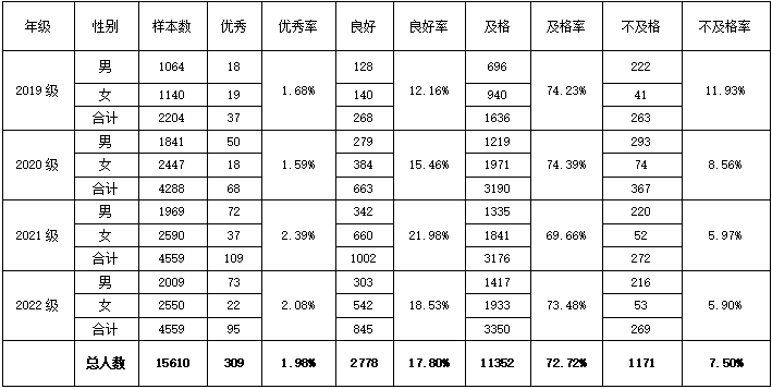 2022年,全校上报数据人数15610人,2019级参加测试班级为23个班,数据上报人数2204人,身体原因办理免测101人,实习班级未参加测试,临床医学专升本班级和护理学专升班级因在教学医院,也未参加测试;2020级参加测试班级为56个班,数据上报人数4288人,因身体原因办理免测136人;2021级参加测试班级为53个班,数据上报人数4559人,因身体原因、保健班、疫情未返校、苏大交流办理免测人数共65人;2022级参加测试班级为56个班,数据上报人数4560人,因身体原因、保健班办理免测人数共99人,预科班未上报测试数据,详细体测分析报告如下: