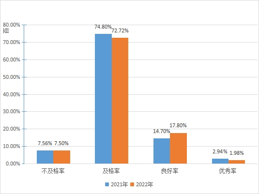 根据图1可知:2022年体测良好率较2021年有了明显提升,2022年良好率为17.80%,2021年为14.70%,相比提高了3.1%;2022年不及格率为7.50%,2021年为7.56%,不及格率变化不明显;2022年及格率和优良率较2021年比有所下降,及格率下降2.08%,优秀率下降0.96%。