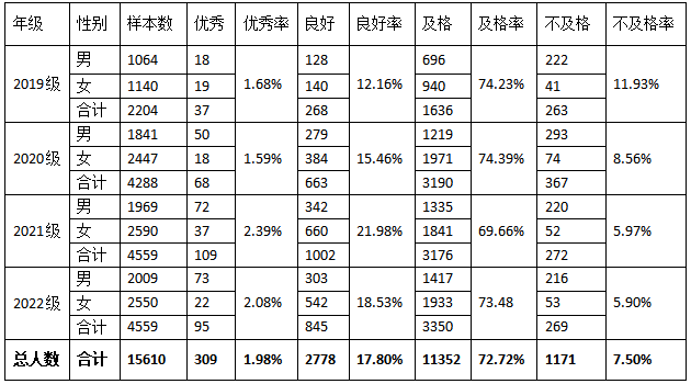 2022年,全校上报数据人数15610人,2019级参加实习班级、临床医学专升本班级和护理学专升班级因在教学医院,未参加测试。2019级参加测试班级为23个班,数据上报人数2204人,因身体原因办理免测101人;2020级参加测试班级为56个班,数据上报人数4288人,因身体原因办理免测136人;2021级参加测试班级为53个班,数据上报人数4559人,因身体原因、保健班、疫情未返校、苏大交流办理免测人数共65人;2022级参加测试班级为56个班,数据上报人数4560人,因身体原因、保健班办理免测人数共99人,预科班未上报数据。现将总体侧结果公示如下: